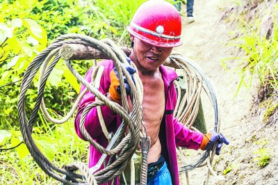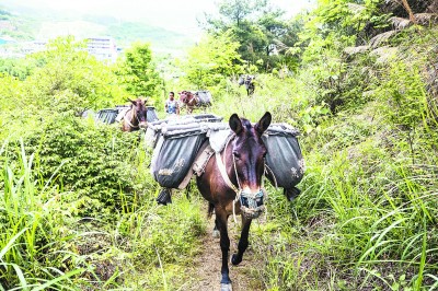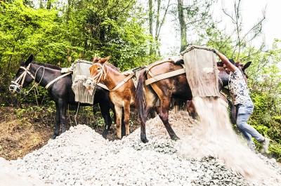每天清晨,伴随着赶马人断断续续的吆喝声,八匹马儿驮着近400斤的负重,行走在山间崎岖狭窄的羊肠小道上,来回十余次;采用肩挑的挑山工们则用自己平凡的肩膀担负着沉重的塔材和设备,不辞辛苦,爬山越岭。就这样,一点一点地将施工所需砂石、水泥和塔材等材料运输到海拔800~1400米的各个塔点,近两个月时间共计运输砂石料1300余吨,塔材300余吨。