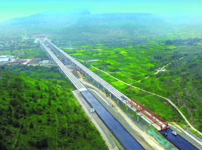 大峪村大桥位于望海石隧道进口与长山隧道出口之间,是全线重难点控制性工程之一,桥梁左幅长982米,右幅长857米,设计桩基150根,箱梁260片,其中25米箱梁100片,30米箱梁160片。 (毛代庆 韩国庆)