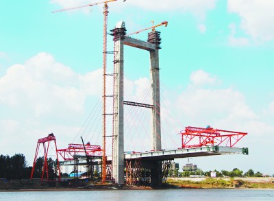 ▲9月14日,由二公司承建的济齐黄河公路大桥北侧主塔率先封顶。该桥为双塔双索面钢混组合梁斜拉桥,全长840米,双向六车道。二公司承建该桥北半部分,长420米,北侧主塔高128米,为我局“重大科研项目”。自工程开工以来,项目部面对工期紧、工程量大、结构设计复杂等困难,组织QC攻关,细化施工方案,强化现场管理,开展劳动竞赛,保证了工程进度和安全质量。 (李鹏 高炼 摄)