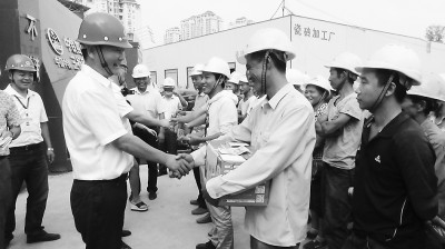 ①9月15日,建筑公司凯里未来城项目部在施工现场开展了“情系农民工 和谐度中秋”关爱农民工活动,向节日期间仍坚守在施工现场的农民工兄弟发放了爱心月饼,送去了暖暖祝福。(刘运琼 摄) |