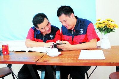 ⇧一公司郑州航空港区地下管廊项目部今年7月20日成立了公司首家读书社,存有励志类、文史类、社科类、经典名著类、名人传记类、散文小说类、专业技术类图书近600余册。这里不仅图书品种齐全、内容丰富,而且环境温馨雅致,成为员工们茶余饭后学习交流的好去处。图为9月6日,午休时该项目部摄影爱好者赵飞(左)、关超(右)正在共同参阅《新闻摄影实训教程》并展开讨论,达到共识的两人露出了幸福的微笑。(殷路新 摄) |
