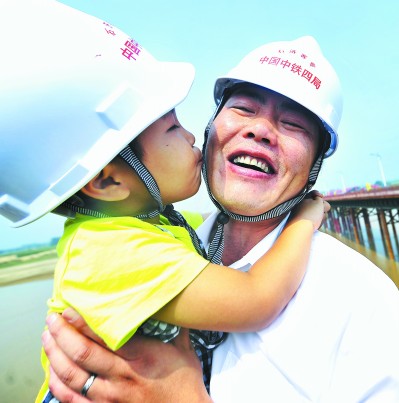 ⇧暑假期间,局石济铁路黄河特大桥经理部(二公司)迎来了一批活泼可爱的“小候鸟”。身为项目试验员的杜永涛,终于见到了自己日思夜想的儿子。由于工作繁忙,他不能常常回家陪伴儿子,这让儿子不免有几分抱怨。为了让儿子更好地理解自己的工作性质,他带着儿子参观了自己日夜奋战的工地。小小年纪的儿子被眼前浩大的施工场景所震撼,他紧紧地搂住爸爸,用一个甜蜜的吻表达了对爸爸无限的崇拜之情,此时杜永涛的脸上不禁洋溢起幸福的笑容,因为儿子的赞赏是对他工作最好的嘉奖。 (王晓悦 张富荣 摄) |