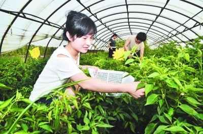 ⇧在二公司哈牡客专经理部四分部的员工菜园里,员工家属周盼正在采摘青椒,自己动手改善伙食。周盼来自安徽阜阳,她说: “蔬菜大棚的开垦,不仅使我们吃上新鲜的瓜果和蔬菜,也能让我们在种植、采摘的过程中,体会到别样的农家乐趣,给人一种回归田园、十分接地气的幸福感。” (刘华成 高炼 摄) |