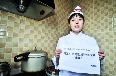 ⇧9月6日,局成贵铁路经理部架梁分部(二公司机械分公司)厨师杨淑琼正在展示自己的心声:以项目为家,把员工当成自家的客人,员工吃得满意,是我最大的幸福!烹饪一手好川菜的杨淑琼来自重庆万州,工作中她对菜谱精心安排,做到每天烹饪菜肴品种不重样,尽量满足员工的不同口味,员工满意度达100%。杨淑琼所在的项目食堂被该分公司连年评为“最幸福食堂”,成为了16个项目食堂中的标杆。 (赵波 龙杰 摄) |