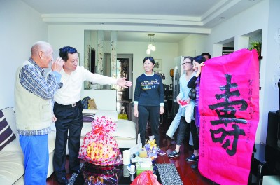 ▲10月9日,局社管(行管)中心开展了“幸福重阳行”爱老敬老慰问活动,中心书记李建平、副主任周建华以及离退休科的全体成员满载着各类慰问品,来到机关6位今年90岁高龄的老寿星家中,将节日的慰问和局领导的殷切祝福送到他们心坎上。图为为翁明生老人祝寿。 (张颖 摄)