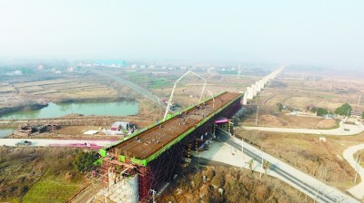 尖山特大桥位于巢湖市庙岗乡,全长2359.57米,其中上跨X100县道连续梁长113.6米,高3.052米,施工工法为满堂支架现浇。 (朱月虎)