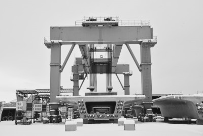2016年12月25日,承德地区迎来岁末最后一场大雪。局京沈客专河北段Ⅳ标段指挥部承德制梁场(一公司)在完成全部制梁任务的情况下,积极与运架分部(八分公司)沟通合作,克服大雪天气给施工带来的不利影响,全力保障运梁架梁施工按计划工期进行。他们通过采取液压油防冻、全面检修刹车系统和配齐相关技术人员等措施,保证了寒冻天气机械运转正常和生产安全。图为该制梁场在雪天进行提梁作业。 (吴义勇 摄)