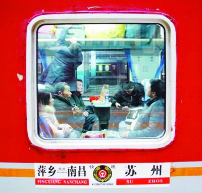 ①1月16日,机电公司电务分公司昌赣客专三电迁改项目部3名农民工,愉快地坐上由南昌开往苏州的K1326次列车回家过年。 (杨琰妤 丁波 摄)