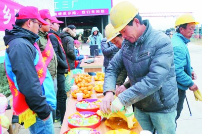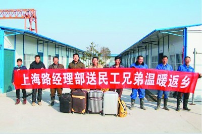 ④1月11日,二公司台州湾大桥项目部在梁场举行了2017年春节农民工平安返乡欢送仪式。截至1月16日,已帮助25名农民工顺利踏上了返乡之路。 (李辉 高炼 摄)