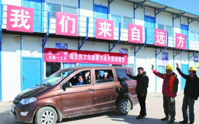 ③1月15日,局太焦铁路经理部一工区(四公司)第一批归家的农民工,坐着工区安排的车辆前往火车站,挥手告别,明年我们再见。 (胡益权 向垚 摄)