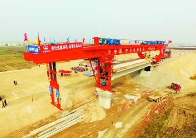3月25日上午,在局连(云港)镇(江)铁路工程站前LZZQ-3标苏北灌溉总渠特大桥桥头,八分公司JQ550型架桥机成功架设连镇铁路全线第一孔单线箱梁,标志着连镇铁路单线箱梁架设施工正式开始。我局承建的连镇铁路站前3标正线全长20.84公里,工程合同总额32.12亿元,工期36个月,由局下属多家子(分)公司共同参建。其中,八分公司主要承担连镇铁路站前3标469孔单线箱梁运架任务。