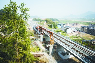 4月15日,随着开化火车站下田坞牵出线最后一片32米T梁顺利落梁到位,由八分公司承担的九(江)景(德镇)衢(州)铁路浙江段709孔T梁架设任务圆满完成。九景衢铁路浙江段自衢州站引出至浙赣省界,全长88.379公里,八分公司承担着全线709孔T梁架设任务。 (杨谦 摄)