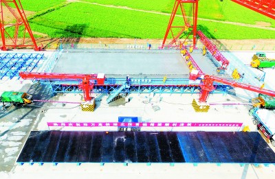 4月14日,局郑(州)万(州)高铁湖北段2标白河制梁场成功预制首片900吨31.5米箱梁。该制梁场占地面积140余亩,承担着郑万高铁湖北段1标、2标共450片箱梁的预制任务。 (陈振 卢建建 摄)