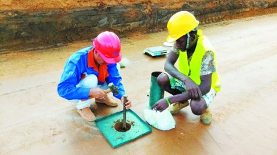 4月10日,一公司安哥拉项目部威热省分部试验室主任韩波带领安哥拉籍员工在做土方压实度试验。一公司安哥拉项目部自开工以来,把“确保工程质量,争当四局海外品牌见证者”理念灌输给每一个员工,施工中坚持“三检制”,实行下一级检测不合格追责上一级检测人员制度,在监理不在场的情况下,项目试验室依然认真做着试验,确保每层填筑土方的压实度。 (吕红刚 摄)