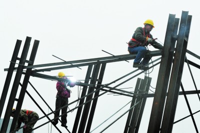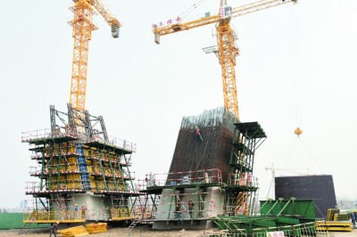 ⇧工人正在进行新洋港斜拉桥主塔柱劲型骨架焊接 |