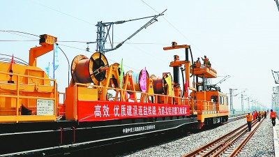 5月17日,局连盐铁路四电工程指挥部(电气化公司代局指)建设者正在进行电气化铁路接触网支柱组立施工。该指挥部承担连(云港)盐(城)铁路四电(通信、信号、电力、电气化)工程施工任务,合同造价18.32亿元。为加快连盐铁路的施工建设,他们组织“四电”施工人员 掀起“百日大干”高潮。截至当日,指挥部开累完成产值6.8亿元,各专业施工均按业主要求完成,正朝节段性工期“6·15”冲刺。 (丁尤国 种明杰 摄)