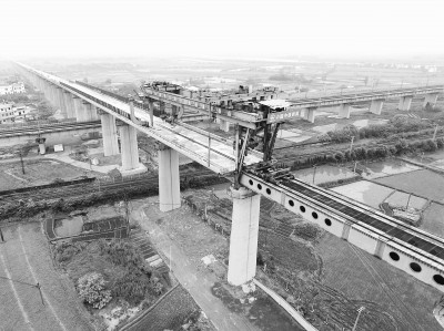 ▲4月27日23时35分,局(南)昌赣(州)客运专线2标项目部(五公司)历经32天共18个铁路封锁点的紧张施工,安全顺利正点地完成了赣抚运渠特大桥8孔上跨既有线箱梁架设任务,为7月底完成管段内所有箱梁架设创造了条件。昌赣客运专线赣抚运渠特大桥上跨京九线上下行、昌福线上下行四线铁路区域,共需架设预制箱梁8孔。 (丁钰玲 储凌鹏 摄)