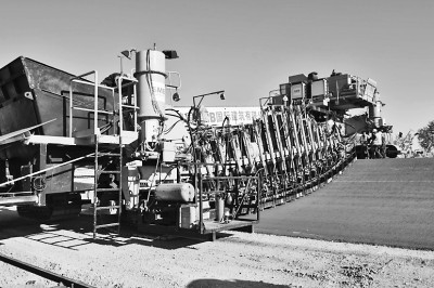 本报长春讯 8月25日,一公司长春一汽大众汽车试验场项目部施工现场出现一个“多脚蜈蚣”,这是来自德国的桥式摊铺机在项目部东高环进行水稳摊铺。这些“脚”其实是电子传感器,每只“脚”里面都装有电子液压传动装备,整装设备体量大、自动化程度高,全断面整幅摊铺,施工精度高,是当今世界最先进的试车场高速环道沥青摊铺设备。