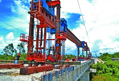 本报茂名讯 9月9日,八分公司深茂铁路项目部DJ180架桥机成功架设谭新大桥最后一片T梁,标志着深(圳)茂(名)铁路江门至茂名T梁架设任务全部完成。
