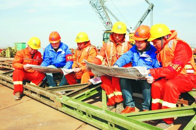 ▲12月10日,二公司五峰山过江通道公路项目部党群工作协理员、党员代表在芒稻河大桥工地对农民工进行党的十九大精神的宣贯。自党的十九大召开后,该项目部党委开展十九大精神进工地活动,项目书记、党群工作协理员、党员代表深入施工现场,宣讲十九大精神,为农民工赠送十九大学习读本和报纸。 (高炼 王磊 桂文军 摄)