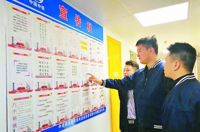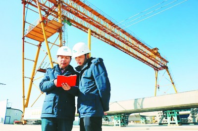 ▲12月11日,局太(原)焦(作)高铁TJZQ-8标长治县制梁场(四公司)老党员、工地驾驶员陈立友(左), 新党员、工区工经部长李靖(右)在工地将该制梁场党工委发放的新党章随身携带,利用业余时间学习。 (戴晓莲 摄)