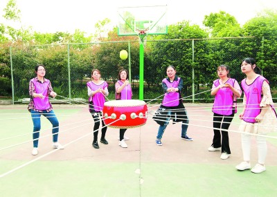 5月15日,四公司工会利用公司对工经系统、财务系统和办公室系统的女职工进行培训的时机,组织28名女职工到紫蓬山脚下开展户外拓展活动。图为女职工正在进行的颠鼓击球训练。 (王晶 摄)