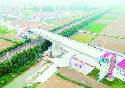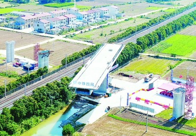 该连续梁位于湖北省襄阳市境内,为郑万高铁湖北段首个转体梁,采用(45+45)米单T构悬臂法浇筑,梁长90.1米,总重4500吨,转动角度为逆时针转动74°。 (康宁 王有星 摄)