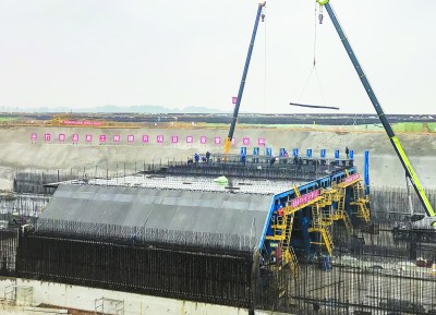 1月9日,在二公司苏(州)(无)锡常(州)南部高速公路太湖隧道建设工地上,施工人员正在冒着雨夹雪进行隧道主体结构顶板钢筋绑扎作业,隧道主体结构框架已现雏形。截至当日,项目部已完成浇筑隧道底板720米、侧墙270米,首节隧道顶板预计在春节前施工完成。 (蔡朝阳 摄)