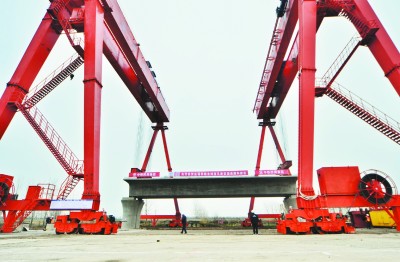 1月9日,国内首孔新型箱梁在中铁四局盐(城)(南)通铁路Ⅰ标项目(二公司代局指)成功架设。此次架设的箱梁是经过优化的后张法预应力双线简支新型梁型,为国内首次在时速350公里高铁应用。该新型箱梁长32米、宽12.6米、高2.8米,总重700吨,与传统箱梁相比,在强度相同情况下,重量减少125.4吨、混凝土减少37.5方、钢筋减少0.55吨、钢绞线减少0.47吨、梁高减少22厘米、底板厚度减少10厘米、腹板厚度减少90厘米、支座吨位由5500千牛/5000千牛统一减小至4500千牛,可大大节约成本,提高施工效率。(赵波 周勇忠 摄)