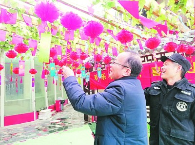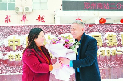 2月14日情人节,一公司郑州南站二分部开展了“十指紧相扣”“牵手一生”“反转告白”等活动。图为党工委书记杜广志为反探亲的爱人孔凡玉送上鲜花。 (刘飞 摄)