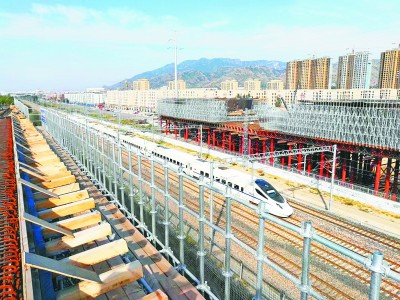 三环路上跨铁路转体梁分左右双幅,施工采用平行于铁路两侧支架现浇、转体就位的施工工艺,转体角度为逆时针转体79度,左右双幅同步转体,单幅转体最大重量约为10000吨。 (陈聪慧 摄)