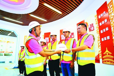 9月21日,二公司南京横江大道一标项目部正式启动“党员安全监督岗”活动,项目部党支部书记洪克林为全体党员授予了监督岗员专用安全帽。 (刘洋 高炼 许优 摄)
