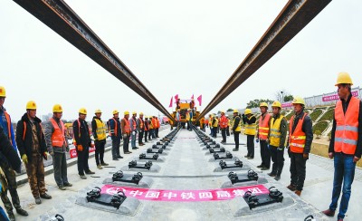 合(肥)安(庆)高铁是国家中长期铁路网规划“八纵八横”高速铁路主要通道京港(台)通道的重要组成部分,线路自新合肥西站引出,经安徽肥西、庐江、舒城、桐城、怀宁等市县,终至新安庆西站,正线全长约162公里,设计时速350公里,共设8个车站。中铁四局八分公司担负铺轨315.183公里、铺设有砟道岔43组、铺设无砟道岔43组的施工任务。 (吴怀球 吴芝滨 摄)