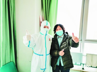除了专业治疗之外,医疗队每天还要花费大量时间抚慰焦虑的患者。张浩用他长期积累的医患经验对情绪急躁的患者开展心理疏导和安慰,用耐心细致的工作赢得患者的赞誉。有一位57岁女患者,家里9名亲戚都确诊了。经过两周的治疗和心理疏导,她已经明显好转。她非常高兴地对张浩说:“我真的想抱抱你,但是不行。我们就做一个加油的手势吧!”还有一位被确诊的30多岁小伙子,辗转过很多地方,也去过隔离点和社区医院,终于住进张浩接管的病区,得到有效救治。这位小伙子说:“因为医院和医护人员不足,我们一些患者只能呆在隔离点或社区医院,无法得到有效治疗,谢谢你们安徽医疗队的到来!”