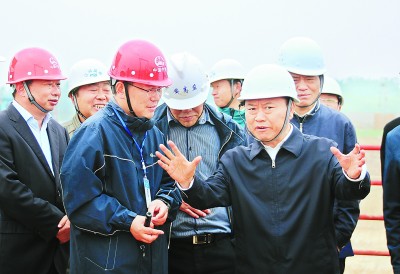 4月18日,安徽省委副书记、省长李国英(右一)到中铁四局引江济淮沪蓉、宁西铁路改建工程上跨江淮运河特大桥128米系杆拱和钢渡槽工程施工现场调研工程建设情况。合肥市市长凌云等有关领导陪同调研。