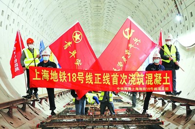 本报上海讯 4月12日,在上海地铁18号线长江南路至殷高路区间,八分公司作业人员正在进行首次混凝土浇注,标志着该地铁线正线开始施工。