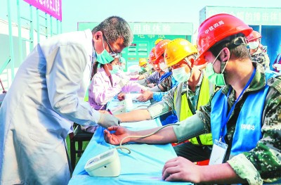 4月13日,建筑公司厦门轨道交通3号线蔡厝车辆基地项目部分批次组织400余名现场作业人员进行免费健康体检,包括血压、血常规、听力、视力、心电图、胸透等10余项体检项目,并建立“一人一档”身体健康档案,旨在进一步强化安全管理防线,切实将关爱农民工落到实处。图为体检现场。 (杨洪菲 张飞 摄)