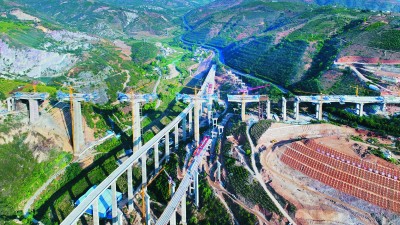 南溪河四线特大桥横跨元蔓高速和昆磨高速,是玉磨铁路重点控制性工程,全长920.3米,最高主墩127米,涉及双柱空心薄壁高墩、双柱式刚架墩、大跨度连续刚构施工,施工工艺复杂、技术难度大、安全风险高。项目部引入智能化施工控制技术,确保南溪河四线特大桥安全优质推进。 (王有星 解晓腊 摄)