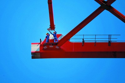 元江特大桥工程全长 832.2米,钢梁总重约为20188吨。截至目前,项目部已经完成48个节间钢梁架设任务,全桥仅剩7个待架节间,按照单节间13.5米长度计算,全桥距合龙仅剩最后94.5米。 (乐一鸣 陈于飞 摄)