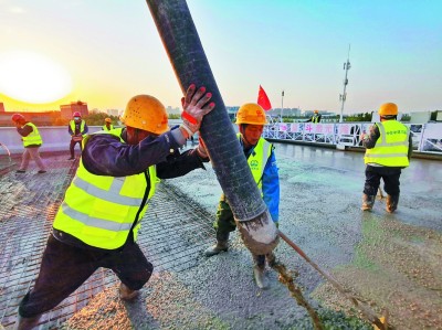 ⇧工人正在进行桥面铺装 |
