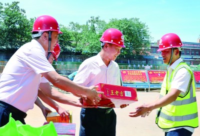 8月14日,九江市人大常委会副主任、市总工会党组书记、主席周美祥,市总工会党组成员、经审委主任李虎一行来到中铁四局五公司九江水环境项目部2#调蓄池施工现场,代表九江市总工会开展“送清凉”慰问一线员工活动。 (唐立 徐文煜 摄)