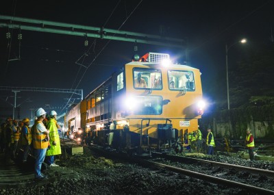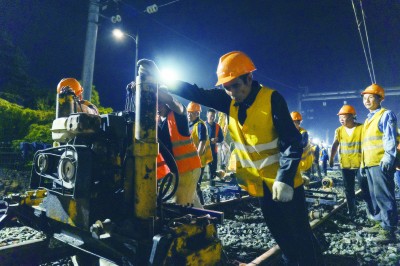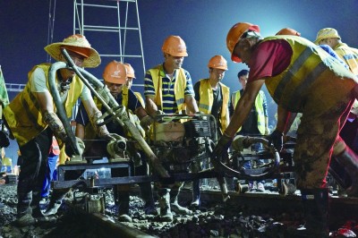 ⇧工人们将轨道拨接至过渡线位 |