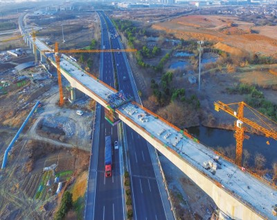 本报南京讯 1月19日,由中铁四局四公司施工的江苏南沿江城际铁路南京段最大跨度连续梁———跨长深高速公路连续梁128米主跨合龙。