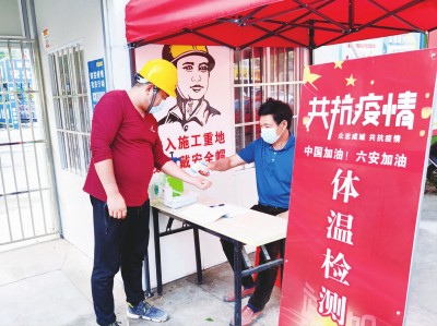 5月13日六安市发现新冠确诊病例后,中铁四局钢结构建筑公司六安站、农行六安分行置换营业用房、六安市中医院等项Q迅速启动应急预案,从严、从实、从快开展疫情防控工作。 (王凯 摄)