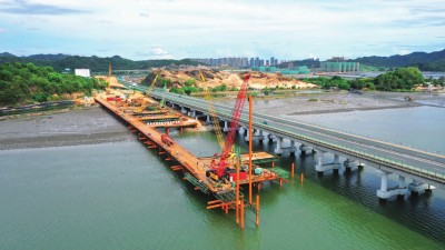 深汕西高速公路改扩建工程起于汕尾市陆丰,路线向西途经汕尾市、深汕合作区、惠州市、深圳市,终于深圳市龙岗区,全长约146公里,是目前广东省投资规模最大、里程最长的高速公路改扩建项目。其中,长沙湾跨海特大桥全长2108米,跨越汕尾市黄江,贯通海丰县梅陇镇、城区马宫街道两岸。 (刘长魁 陈振 摄)