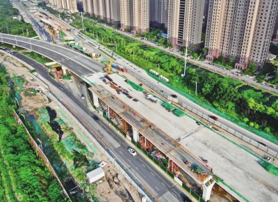 8月23日,中铁四局二公司徐州分公司三环南路4标施工难度最大的桥梁顶升作业正式开始。本次顶升改造范围为现三环东路高架桥,两联预应力混凝土连续梁共174米。采用等比例同步顶升施工工艺,直接顶升箱梁,保持预应力混凝土连续梁结构形式,顶升最大高度达3.64米,总重达9480吨。 (姚建立 摄)
