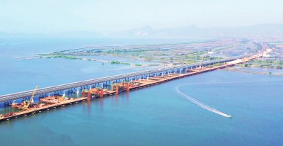 长沙湾跨海特大桥全长2108米,紧邻出海口,潮汐频繁,潮差流速大,水文条件复杂,为深汕西改扩建全线控制性工程。该桥采用拆除既有特大桥重建方案,根据工程设计,主墩采用双孔双向通航,设置主墩3个。 (刘长魁 摄)