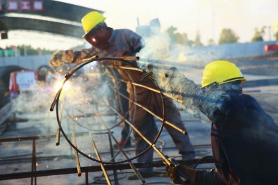 景德镇国际陶瓷博览交易中心项目是国家试验区建设的重点项目。11月初开工后,项目部就组织桩基础专项劳动竞赛活动,上足施工机械,精心组织生产,仅仅十天时间就完成桩基总量的71%。图为11月10日施工人员在焊接桩基础钢筋笼。 (胡效民 摄)