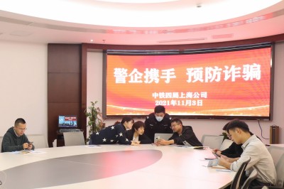 11月3日,中铁四局上海公司联合静安区共和新路街道派出所开展“警企携手 预防诈骗”警企共建活动。图为干警为项目员工做反诈骗案例讲解。 (万杰 章梦龙 摄)