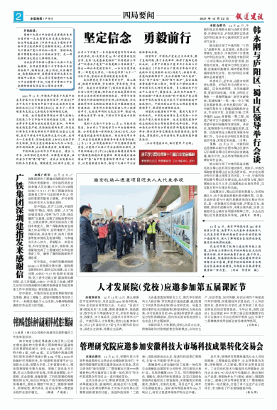 本报合肥讯 12月21日,中铁四局总经理韩永刚与合肥市委常委、市委秘书长、庐阳区委书记单虎在庐阳区政务中心就深化双方合作举行会谈。